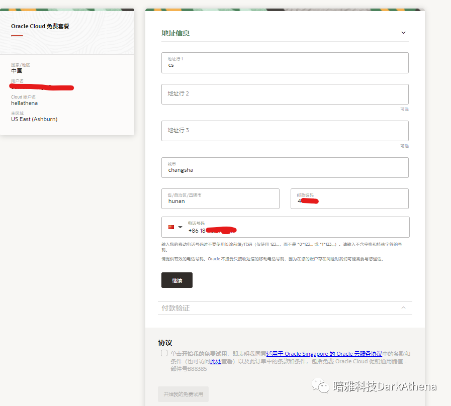 6. 在弹出的页面中,继续补全密码、公司信息,注意主区域只能选择一次,这个关系到你的网络是否能正常打开云服务页面及可以享受哪些云服务(我第一次申请是东京,感觉挺慢,不知道其他地方怎么样),你可以点击下面的“参见区域”来确定。