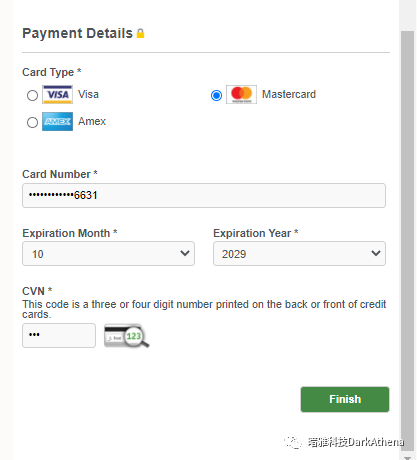10. 选择你的信用卡类型、输入信用卡号、有效期的月和年、CVN号(信用卡背面有一串数字的最后单独3位数),点Finish,注意一张信用卡只能注册一个账号(建议确认上方是否为真实身份信息,毕竟只能注册一次)