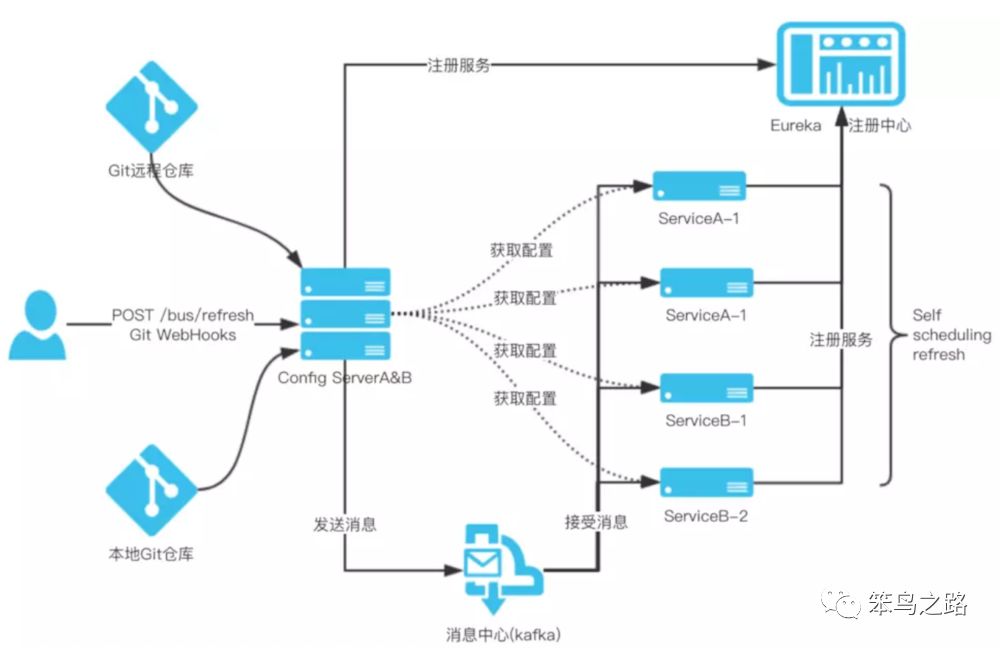 同时架构图中看到最右侧,有一个Self scheduleing refresher 是自定义新增的一个扩展功能,目的是当依赖的消息组件出现问题时,此时如果Git仓库配置发生了变更,会导致部分或所有客户端可能无法获取到最新配置,这样就造成了客户端应用配置数据无法达到最终一致性,进而引起线上问题。