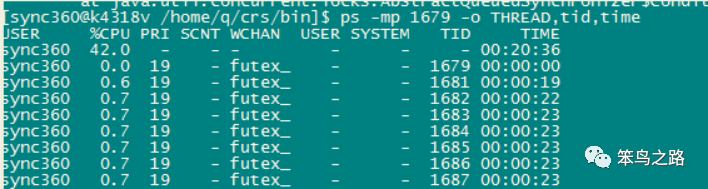 2. ps -mp pid -o THREAD,tid,time命令查看该进程的线程情况,找到tid
