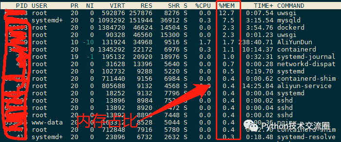 由于终端直接输入top命令无法快速查找到占用内存大的进程,所以需要以内存占用大小来排序