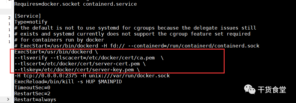 ExecStart=/usr/bin/dockerd \--tlsverify --tlscacert=/etc/docker/cert/ca.pem \--tlscert=/etc/docker/cert/server-cert.pem \--tlskey=/etc/docker/cert/server-key.pem \-H tcp://0.0.0.0:2375 -H unix:///var/run/docker.sock
