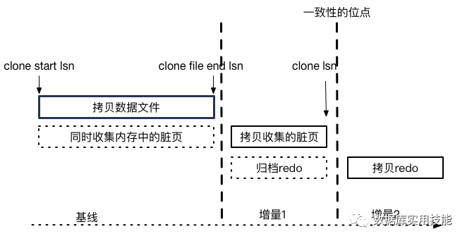 每一步的分界点都以lsn来区分 基线拷贝所有的文件(clone start lsn -> clone file end lsn) 增量1拷贝 clone start lsn到clone file end lsn之间搜集的脏页 增量2拷贝 clone file end lsn到clone lsn归档的redo