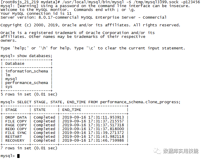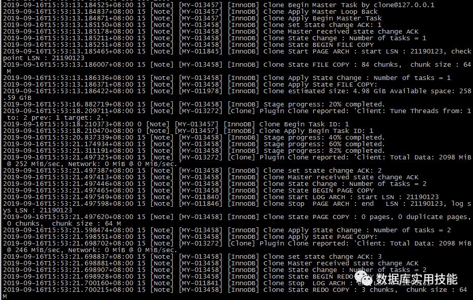 mysql> CLONE INSTANCE FROM repl@'10.152.69.141':3399 IDENTIFIED BY '123456';