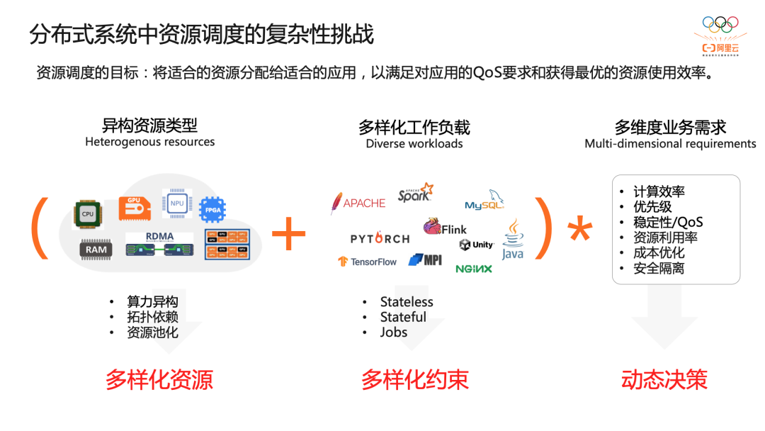 对多形态异构资源的支持,今天应用所需的计算资源不只是简单的 CPU,内存,存储等,而且包括多样化的加速设备,比如 GPU、RDMA 等。而且,为了考虑到计算效率的最优化,要考虑到计算资源之间的拓扑,比如 CPU core 在 numa 节点间的布局,GPU 设备间 NVLink 拓扑等。此外随着高性能网络的的发展,GPU 池化、内存池化等相继出现,给资源调度带来更多的动态性和复杂性。 对多样化的工作负载的支持。从 Stateless 的 Web 应用、微服务应用,到有状态的中间件和数据应用,再到 AI、大数据、HPC 等计算任务类应用。他们对资源申请和使用的方式有不同的需求。 对多维度的业务需求的支持。调度系统在满足应用对资源的需求的同时,也要满足不同的业务需求,比如计算效率,优先级,稳定性,利用率等等。