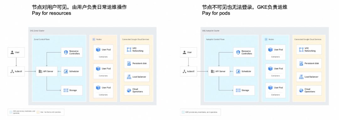 GKE Autopilot 集群节点池/节点对用户不可见,也无法登录进行运维。 用户为应用申请的资源付费,而不是为底层资源进行付费。 用户无需进行容量管理。GKE Autopilot 的调度和计费单位是 Pod,但是扩容的单位仍然是节点实例。当用户部署/扩容应用时,GKE 会先尝试调度到已有节点中;如果资源不足,GKE 服务根据 Pending Pod 来动态创建相应节点池/节点来适配应用;同理当应用删除/缩容时,GKE 服务也会根据情况缩容节点池来释放实际使用资源。