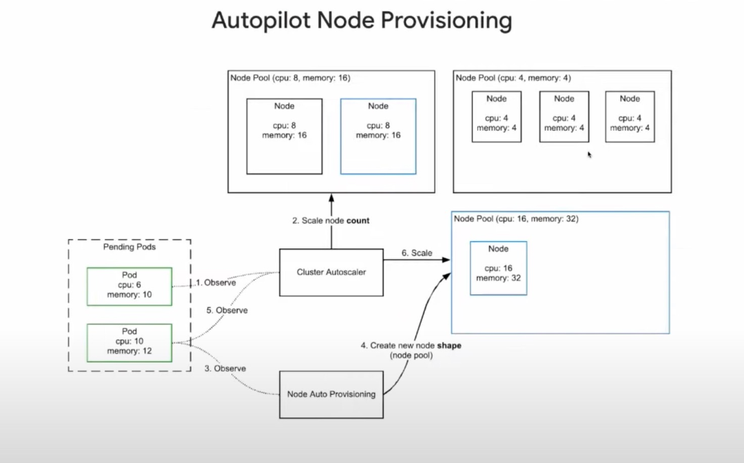 注:GKE Autopilot 基于节点池进行伸缩,每个节点池中实例规格保持一致,整个节点创建流程如下图所示。