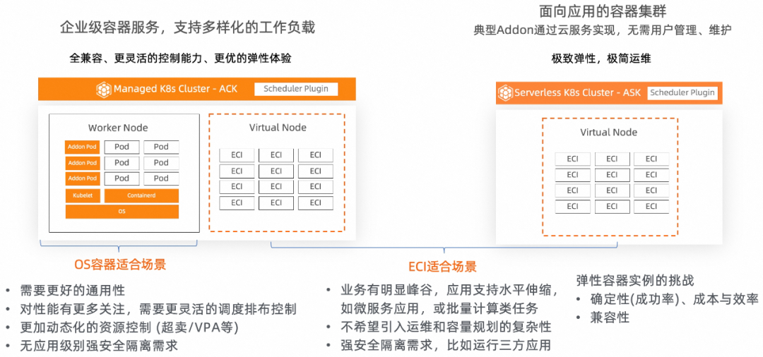 Pod 与节点生命周期不同步 节点就绪后,才能进行 Pod 调度,降低了弹性的效率 节点维护/下线/缩容,需要迁移所有节点上的 Pod,极大增加了弹性的复杂性。 同节点内部 Pod 共享资源 共享内核,扩大了攻击面。用 OS 提供的 namespace,seccomp 等机制无法实现很好的安全隔离。 共享资源,产生相互影响。CPU,内存,I/O,临时存储容量等,有些无法通过 cgroup 进行很好的资源隔离。 容器网络与节点网络独立管理 要为节点,容器、Service 独立配置 CIDR 在跨多个可用区、混合云、或者企业网络拓扑编排等较复杂场景下,大多数客户缺乏足够的能力实现合理的网络规划。 容量规划与弹性配置复杂 需要用户管理节点池,选择合适的节点规格进行扩容,优化整体资源利用率,增加了复杂性。