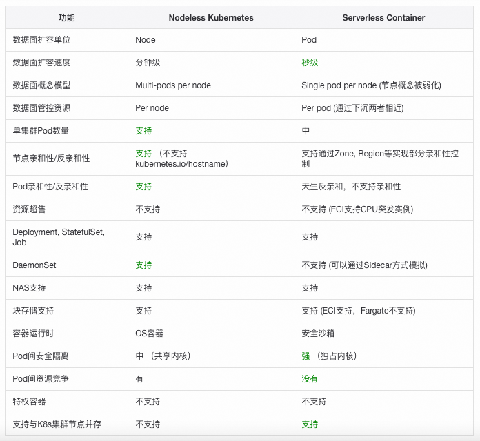 Nodeless 更加注重对兼容性的支持,保留了节点的概念。 Serverless Container 适当绝大部分保障兼容的前提下,更侧重弹性和简化。