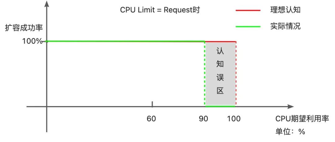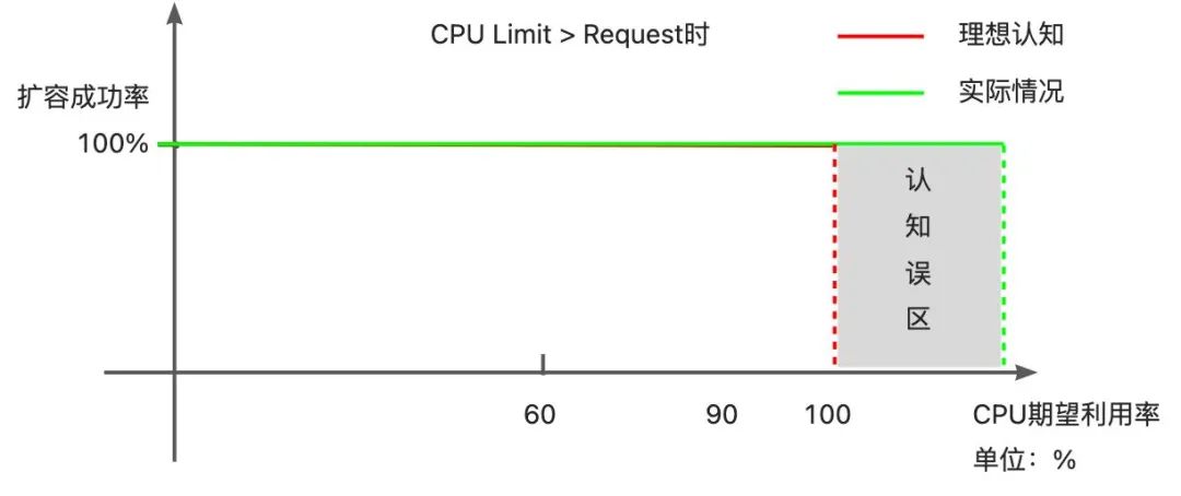 现象:当 Limit > Request 时,配置 50%的利用率,使用量未达到 Limit 的 50%便扩容。