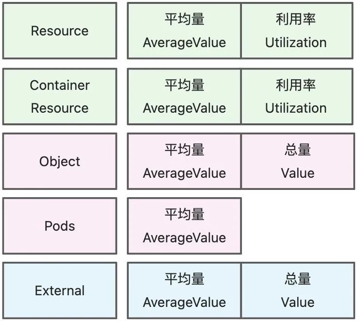 值得一提的是,利用率是基于 Request 进行计算的,所以没有设置 Request 的场景下,HPA 可能无法正常工作。下图介绍了五种指标来源支持的期望类型,不难看出所有指标来源都支持平均量。