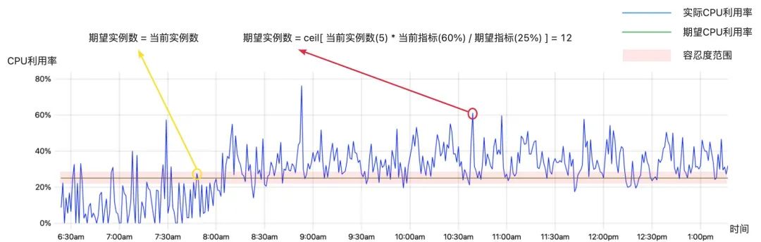 这里面引入了容忍度的概念,即认为在期望值附近小范围的抖动是可以容忍忽略的。这个参数的来源是因为指标值是一个一直在抖动变化的值,如果不忽略微小的变动,那么很有可能造成应用不断的扩容缩容,进而影响整个系统的稳定性。如下图所示,当指标值落入粉色区域内(容忍度范围)时,期望实例数等于当前实例数。粉色区域(容忍度范围)的上下限分别是 0.9 倍期望值与 1.1 倍期望值。