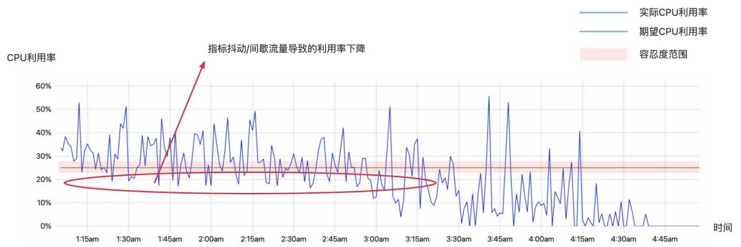 其中 target1, ..., target n 分别是每个指标计算出来的期望实例数。用一句话简要概括计算方法:单个指标波动小时忽略不计,多个指标之间取最大值,最终实例数会落在下限和上限之间。在某些情况下,指标数据会有一个频繁且大幅度的抖动。如下图所示的一段 CPU 指标数据,存在一些指标抖动或间歇流量下降导致利用率下降,指标的变化范围已经超出了容忍度的范围。此时,从应用稳定性角度来看,我们不期望应用缩容。为了解决这个问题,HPA引入了配置来控制扩缩容,即扩缩行为(behavior),它是在HPA(autoscaling/v2beta2)中引入,要求 Kubernetes 集群版本>=1.18。