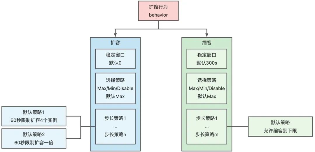 HPA 的弹性行分为扩容行为和缩容行为。行为具体由以下三部分组成:- 稳定窗口:稳定窗口会参考过去一段时间计算出的期望实例数,选取极值作为最终结果,从而保证系统在一段时间窗口内是稳定的。对于扩容取极小值,对于缩容取极大值。