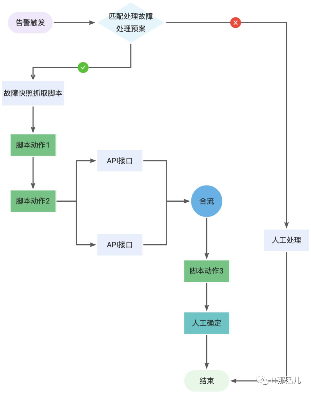 消极自愈治标不治本,例如磁盘告警后的自动清理和扩容,只要产生相关告警直接进行磁盘扩容或清理。第一种是全消极自愈,当监控平台出现告警之后直接调用自动化平台的操作去做执行脚本进行恢复,其实这种严格来说是一种消极的故障自愈,也没有什么故障的根因分析,一旦出现问题直接上三板斧(重启、关机、切流)或者是直接执行告警恢复预案。如果执行不了预案就只能进行人工处理直至进行问题闭环。这种自愈主要面向的是一些数据库杀锁、文件清理、中间件/数据库DOWN等简单的场景。第二种半消极自愈,这个半消极自愈是笔者的自己理解,所谓的半消极自愈说的是在执行自愈预案之前先进行故障快照的抓取,保留一部分故障现场。当然这里还有层意思是说有些故障告警是单一脚本无法进行恢复,需要脚本、API接口、人工判断,通过流程引擎将这几个对象进行串联或者并联,甚至将上一个操作的结果输出到下一个结果来完成一系列的自愈流程来进行故障处理。如下图是一个简单的自动故障处理流程,告警触发之后匹配处理策略,如果匹配成功就进行故障快照抓取脚本,再去执行脚本动作1再到脚本动作2,这可能涉及到去调用业务系统的API接口然后触发一个合流的动作,将两个API调用的结果合并在一起输出至另一个脚本进行执行,最后需要人工确认是否故障处理完成,人工判断确认执行点击通过结束故障处理流程。