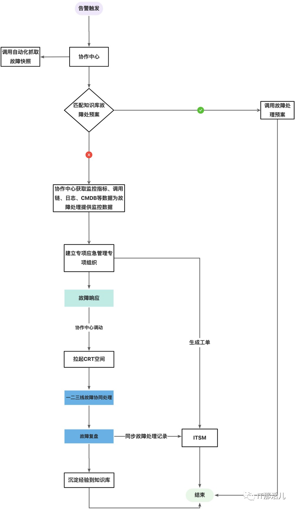 上面介绍的故障处理流程可能非常长,在真实环境中肯定是以恢复故障为主,流程看似很长,其实通过运维协作中心串联起来之后就会很快的去流转起来,推动整个流程的闭环。本文主要是介绍的故障处理的过程,也掺杂了一点故障复盘的东西,真实的故障管理是包括故障等级定义(有些告警是不能作为故障的,笔者认为只有影响到整个业务系统缓慢、卡顿、hang的告警才能判定为故障)、故障发现、故障响应、故障应急、故障恢复、故障复盘及持续改进。