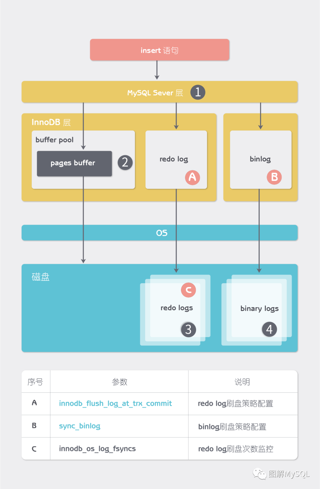 如果开启了 binlog 日志,我们还需将事务逻辑数据写入 binlog 文件,且为了保证复制安全,建议使用 sync_binlog=1 ,也就是每次事务提交时,都要将 binlog 日志的变更刷入磁盘。