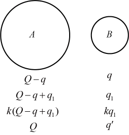 考虑到电荷们被抢夺完毕时,A、B间接触与不接触,也就是弄根导线把A、B连接或不连接,不影响电荷的分配。类比到地面上的高度,两个瓶口一样高度了,A瓶口对着B瓶口倒水,谁也再倒不出、谁也再装不下,等高了;也就这里的A、B两个球等势了。假设在无穷远还有两个金属极,并且A、B带了正电荷。就可以设A、B电势均为φ。A与无穷远的极构成电容器C1、B与无穷远的极构成电容器C2。
