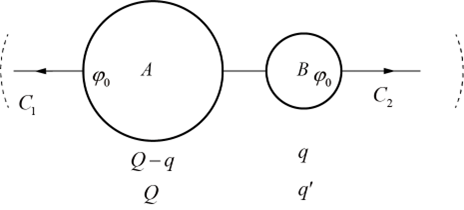 由图,设A最后被充满Q电量时,电势变成φ1了,于是Q-q=C1φ0、Q=C1φ1,q=C2φ0、q'=C2φ1。可解。
