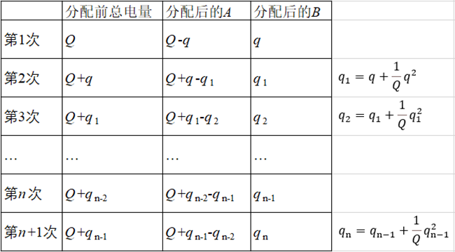 这样,我们如果能够得到qn的通项,令其通项中相邻的两项相等,则可解出项数n,这个n的意思,就是对应这样的操作:A、B两球在那碰啊碰啊碰,但是电荷不再重新分配了,而此时从表格最后一行第3列上可以看到,A上的电量就是Q。