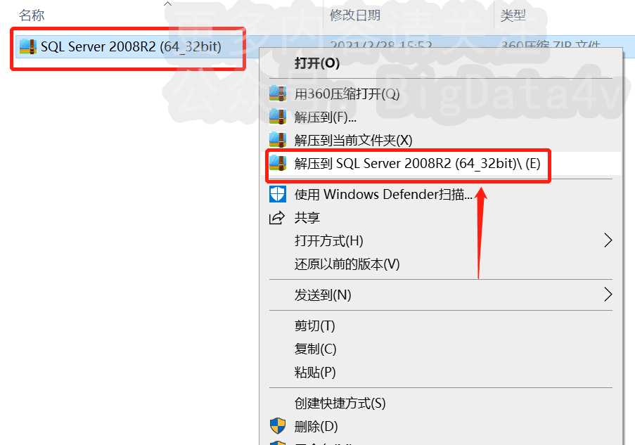 1.选中【SQL Server 2008R2 (64_32bit)】软件压缩包,鼠标右击“解压到SQL Server 2008R2 (64_32bit)”