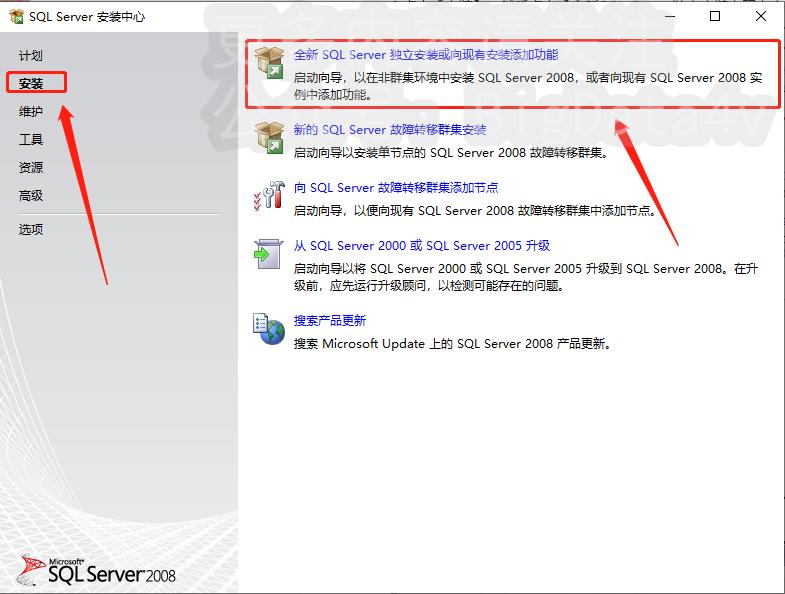 6.点击【安装】,然后点击【全新SQL Server独立安装向现有安装添加功能】