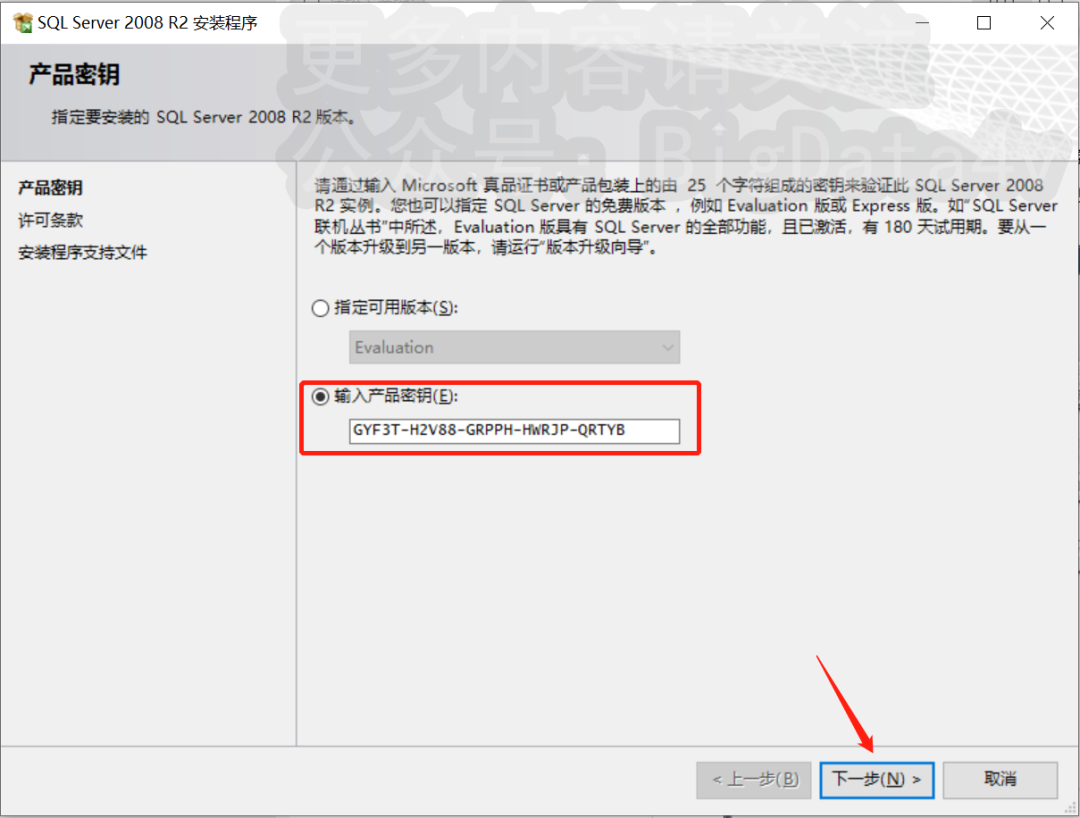 8.密钥会自动填入,如果没有自动填入则需要手动输入。密钥1:JD8Y6-MQG69-P9M84-XDTPG-34MBB。输入好后。密钥2:GYF3T-H2V88-GRPPH-HWRJP-QRTYB