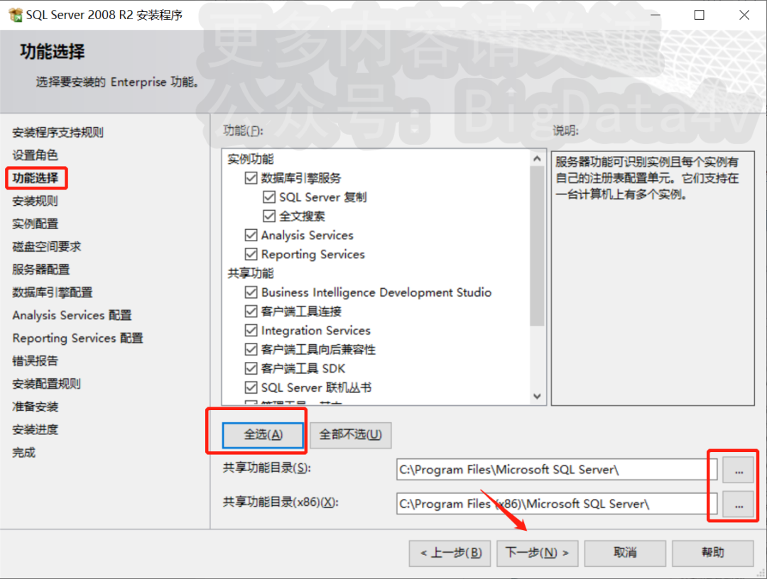 14.先点击【全选】,点击【...】更改软件安装路径:建议安装到除C盘以外的磁盘,可在D盘或其它盘里面新建一个文件夹【sqlserver】,点击【下一步】