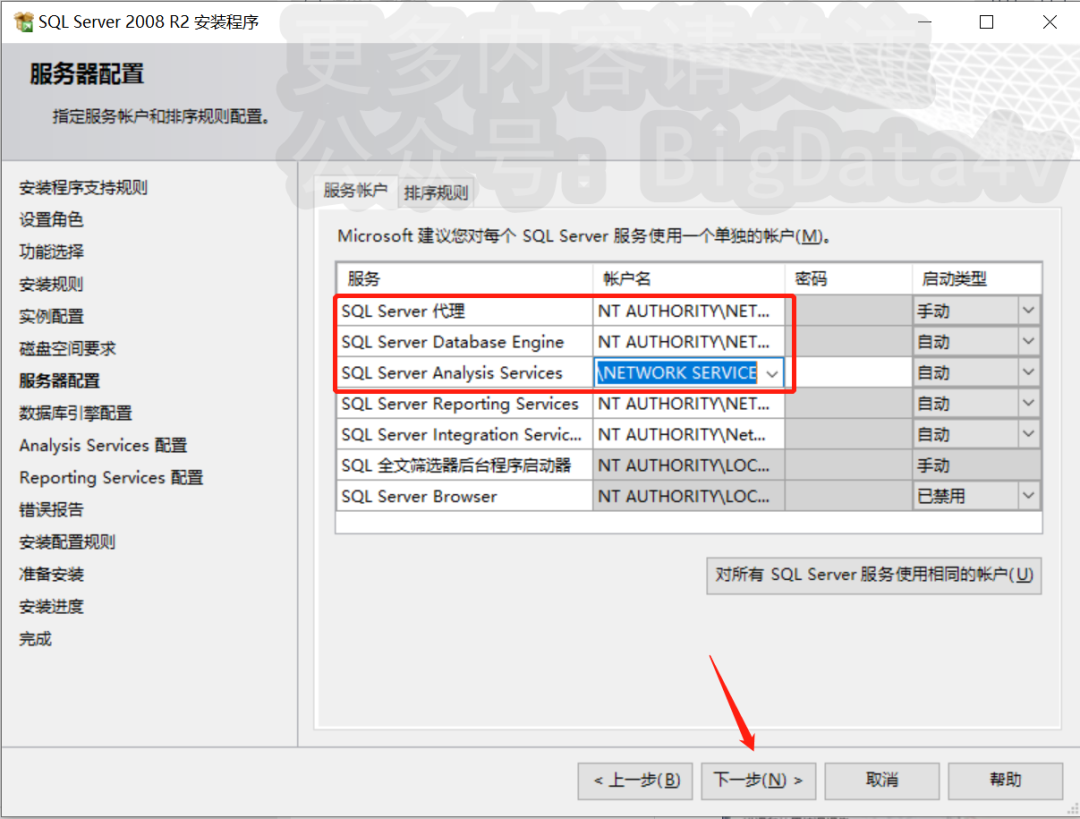 17.账户名全部选为【NT AUTHORITY\NET...】,点击【下一步】