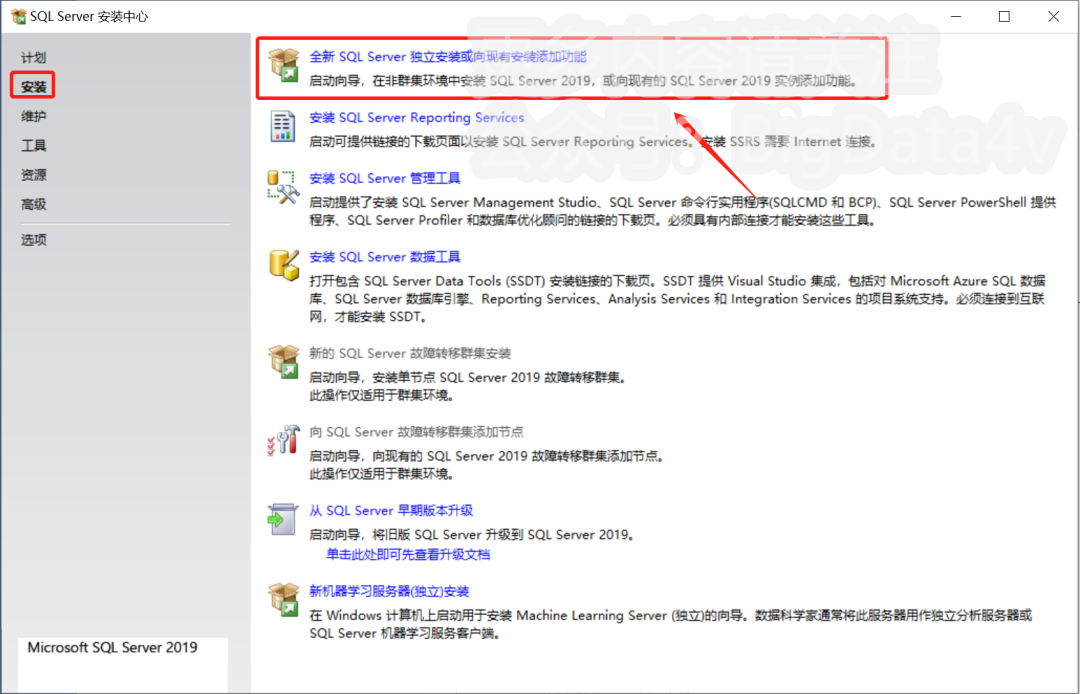 4.点击【安装】,点击【全新SQL Server独立安装或向现有安装添加功能】