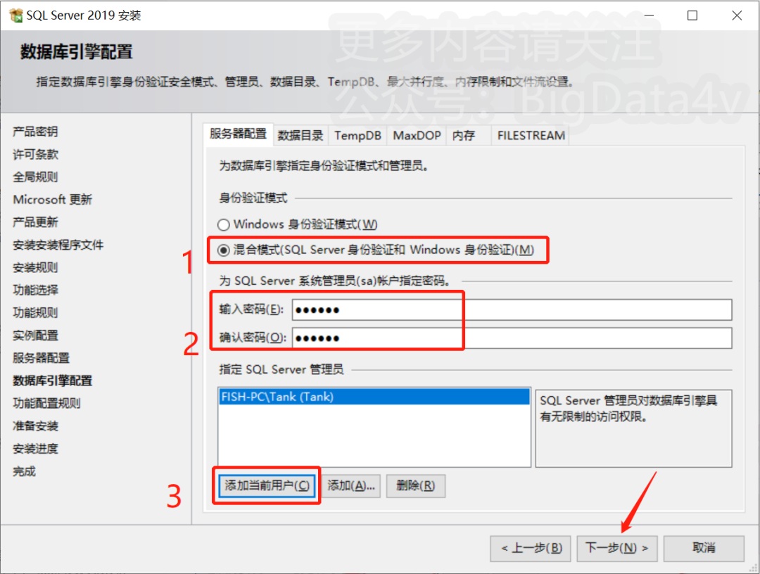 PS:也可以仅选择Windows身份验证模式,添加当前用户之后,直接点击下一步
