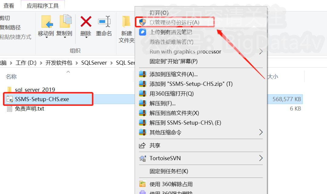 16.打开安装包解压后的【SQL Server 2019(64bit)】文件夹,鼠标右击【SSMS-Setup-CHS.exe】选择【以管理员身份运行】