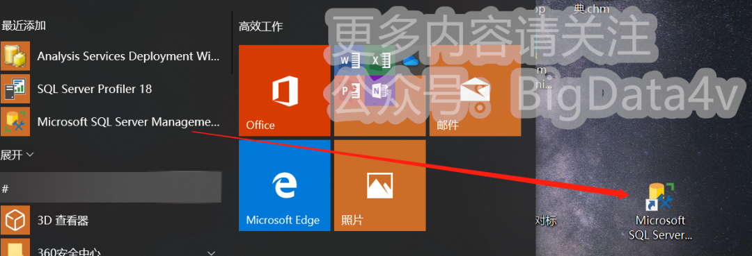 20.创建桌面启动快捷方式:点击桌面左下角【开始】图标,点击【所有应用】→找到并拖动【Microsoft SQL Server Management Studio 18】图标到电脑桌面