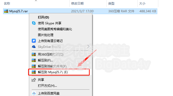 1.鼠标右击【MySQL5.7】压缩包选择【解压到 MySQL5.7】。