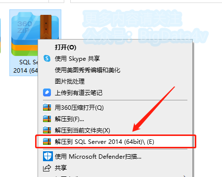 1.选中【SQL Server 2014】软件压缩包,鼠标右击“解压到SQL Server 2014”