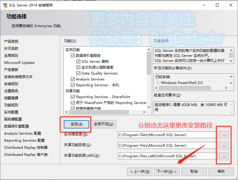 12.先点击【全选】,分别点击【...】更改软件安装路径:建议安装到除C盘以外的磁盘,可在D盘或其它盘里面新建一个文件夹【sql】,点击【下一步】