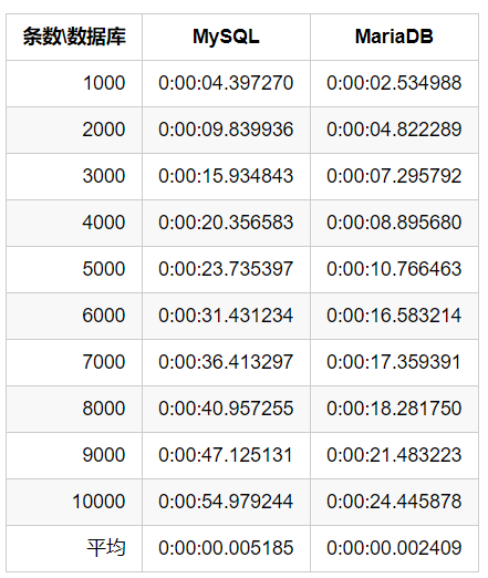 MariaDB 用时 2 分 47 秒,MySQL 用时 3 分 48 秒。再用上面的测试项目进行测试,结果如下表所示: