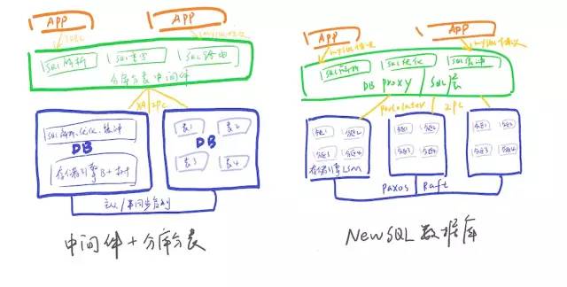 NewSQL数据库相比中间件+分库分表的先进在哪儿?画一个简单的架构对比图: