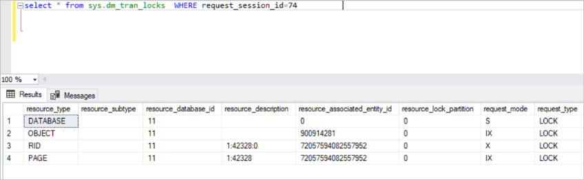 在上图中,您可以看到锁定的资源。SQL Server 获取该行中的独占锁。(RID:用于锁定堆中单个行的行标识符)同时,SQL Server 获取页中的独占锁和 TestBlock 表意向锁。