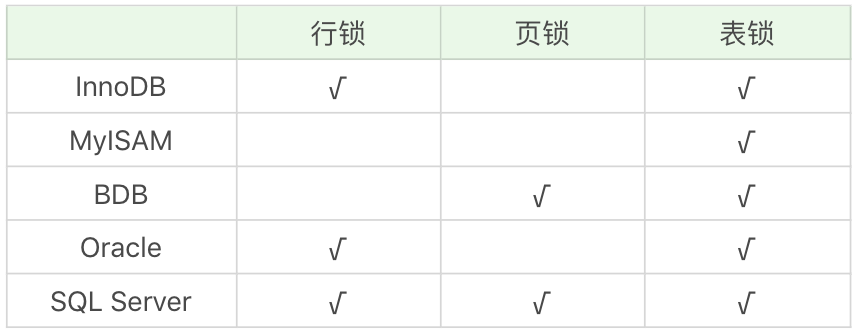 不同数据库支持的锁力度不同,甚至同一种数据库不同的引擎支持的锁力度都不同,如下表所示(来源于网络)