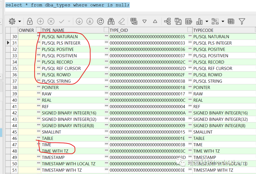 如果问oracle里支持哪些类型,先看官方文档没问题,但由于前面的经验,一定会怀疑文档写得不全,就会去查dba_types,太多了,大概扫一眼,加个owner为空的条件,就是oracle里的所有“基本”数据类型,除了发现的确有"time"这个类型外,还发现有些类型的名称和实际使用的不完全一致,比如常见的"PLS_INTEGER"在视图里的名称和CODE均为"PL/SQL PLS INTEGER"。