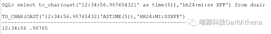 select to_char(cast('12:34:56.987654321' as time(5)),'hh24:mi:ss XFF') from dual;