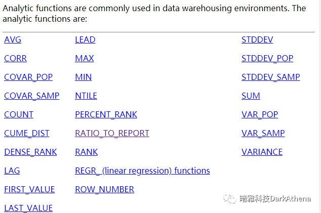 从最新的21c官方文档里提取出专用的分析函数 https://docs.oracle.com/en/database/oracle/oracle-database/21/sqlrf/Analytic-Functions.html#GUID-527832F7-63C0-4445-8C16-307FA5084056