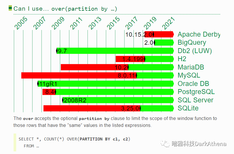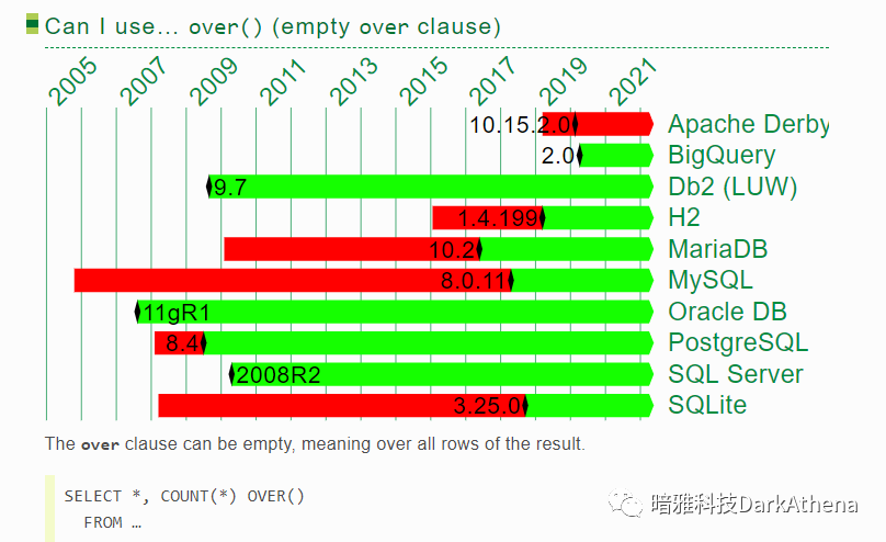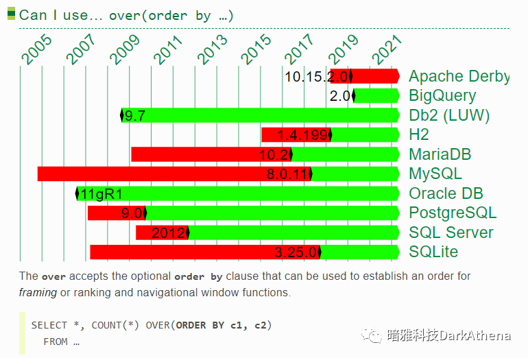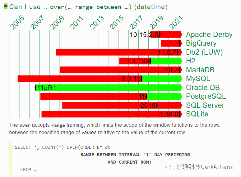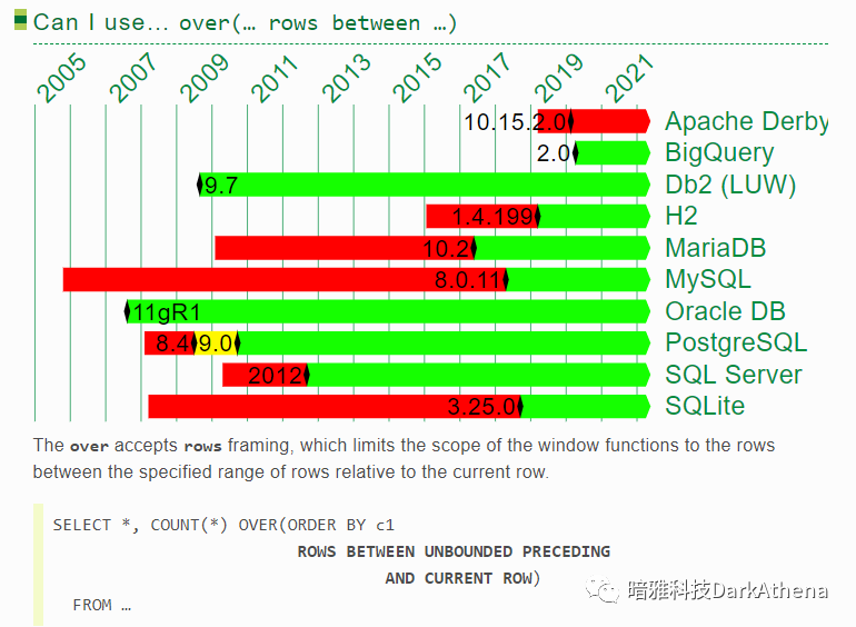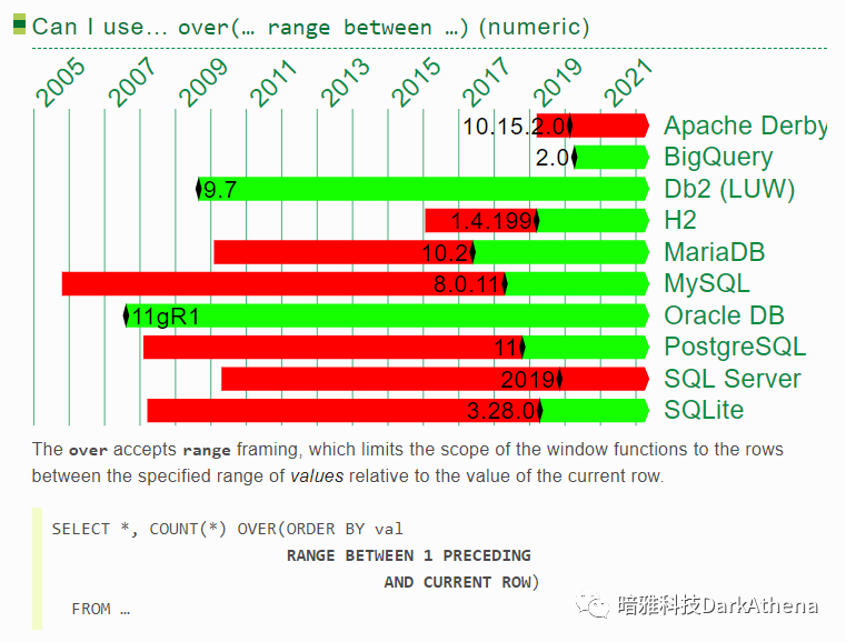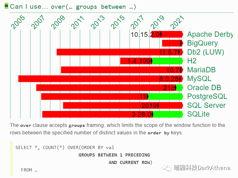 可以发现,ORACLE和DB2几乎一直都有接近最完整的分析函数体验,但在2017年到2020年,被postgresql/h2/sqlite反超了!range一直让人用得不爽,而postgresql率先支持了groups,这就是开源的力量!(关于rows/range/group的区别可参考 这篇文章中的一个示例 https://www.darkathena.top/archives/21c-analytic-functions)