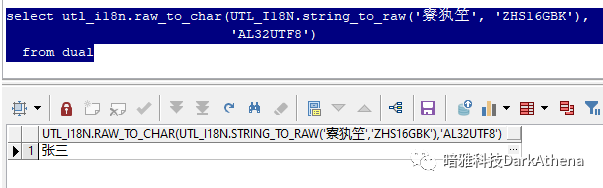 select utl_i18n.raw_to_char(UTL_I18N.string_to_raw('寮犱笁', 'ZHS16GBK'), 'AL32UTF8')