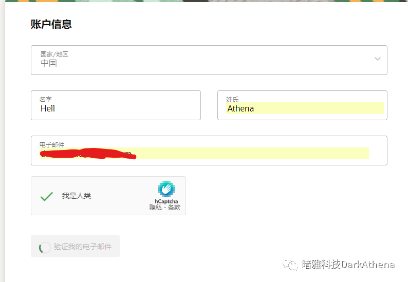 4. 填写国家、姓名、电子邮件(建议用真实身份信息),勾选“我是人类”,完成验证,会自动发送验证邮件