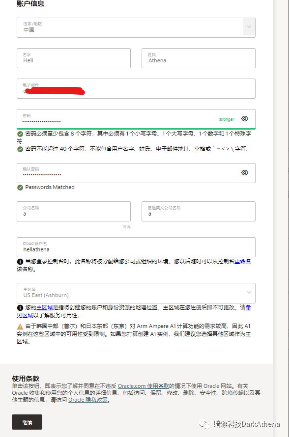 6. 在弹出的页面中,继续补全密码、公司信息,注意主区域只能选择一次,这个关系到你的网络是否能正常打开云服务页面及可以享受哪些云服务(我第一次申请是东京,感觉挺慢,不知道其他地方怎么样),你可以点击下面的“参见区域”来确定。