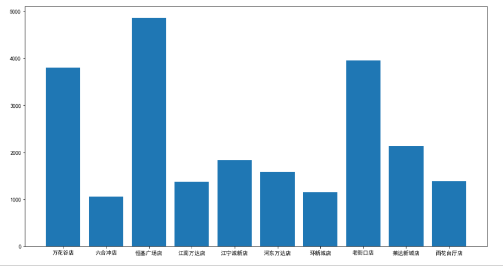 plt.figure(figsize=(15,8))plt.bar(gb_shop_name_df['店铺名称'], gb_shop_name_df['数量'])plt.show()