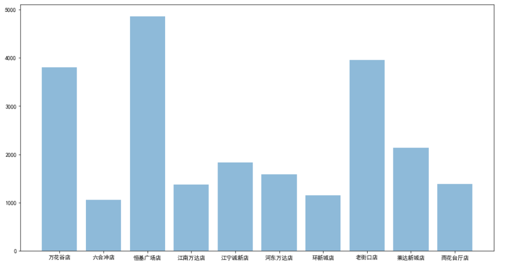 plt.figure(figsize=(10,8))plt.bar(gb_shop_name_df['店铺名称'], gb_shop_name_df['数量'], alpha=0.5) # 添加透明度plt.show()