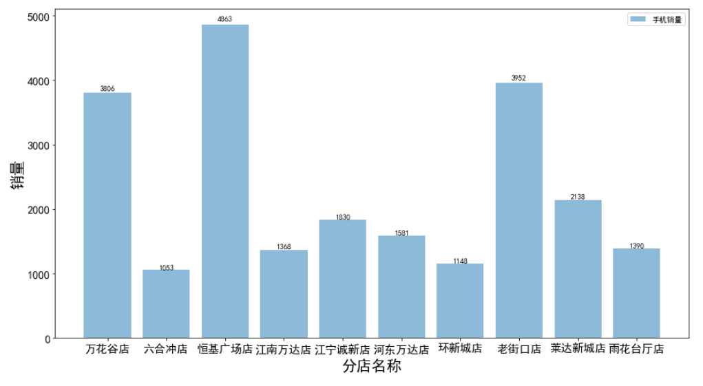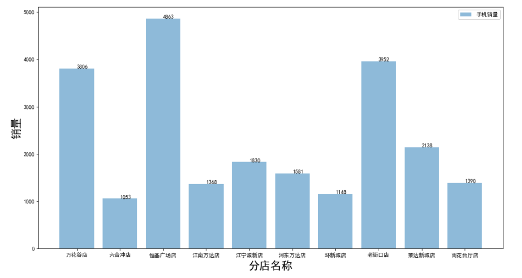 plt.figure(figsize=(15,8))plt.bar(gb_shop_name_df['店铺名称'], gb_shop_name_df['数量'], alpha=0.5, label='手机销量') # 添加图例plt.xlabel('分店名称', fontsize=20) # 添加x轴标签,并设置字体大小plt.ylabel('销量', fontsize=20) # 添加y轴标签,并设置字体大小plt.legend() # 显示图例plt.show()